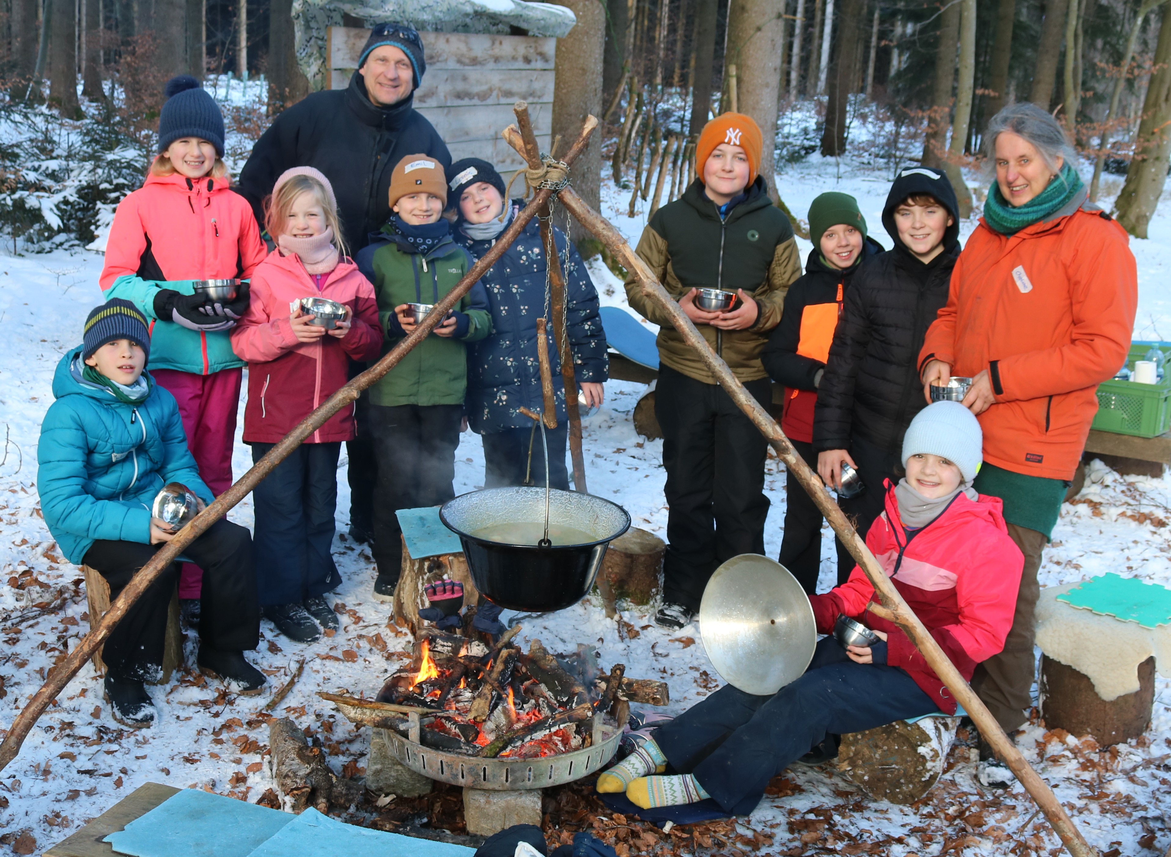 Unterstützt von Waldpädagogin Christiane Jahn und Schulsozialarbeiter Andreas Dionyssiotis sammelten die Kinder zunächst Brennholz und entzündeten ein Feuer. Anschließend schnitten sie Karotten, Süßkartoffeln, Lauch, Brokkoli, Kohlrabi, Pastinaken, Wurzelpetersilie und frische Petersilie und kochten daraus über den Flammen eine wohltuende Gemüsesuppe. Der Schulwald erwies sich dabei erneut als besonderer Lernort, an dem fächerübergreifendes Arbeiten und nachhaltiges Handeln praktisch erlebt werden können.